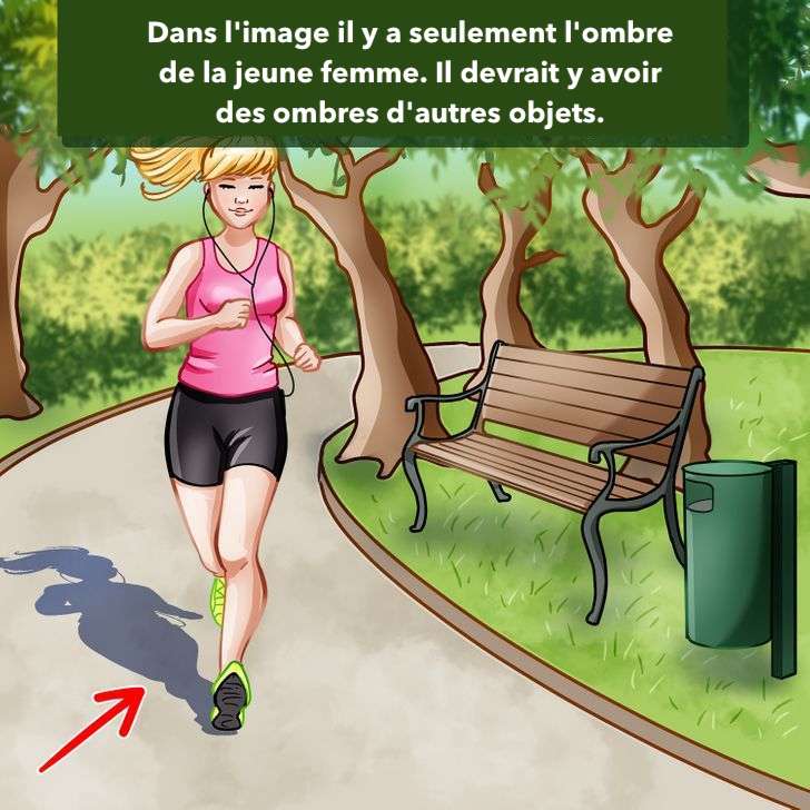 Revenons à notre joggeuse. Avez-vous scruté attentivement ? Concentrons-nous sur un élément souvent occulté : le jeu des ombres. Sur la photographie, la sportive projette bel et bien sa silhouette ombragée, comme on s’y attend en pleine lumière. Mais qu’en est-il des arbres ? Des bancs ? Des autres éléments du décor ? Incohérent.