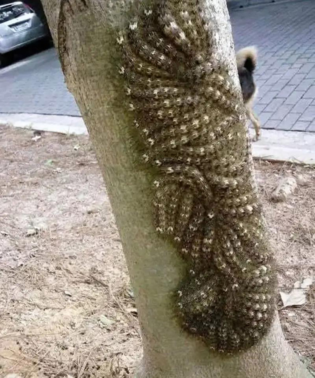 La stratégie de survie de ces petites bêtes ? Leur incroyable capacité à se fondre dans le paysage. Agglutinées sur le tronc, elles imitaient à la perfection des lichens ou des rainures du bois. Il s’agissait en réalité de chenilles processionnaires, ou similaires, dont les poils minuscules peuvent causer de vives irritations.