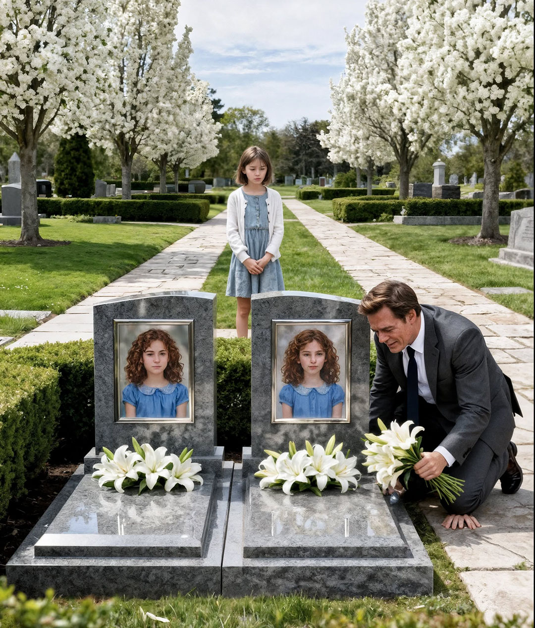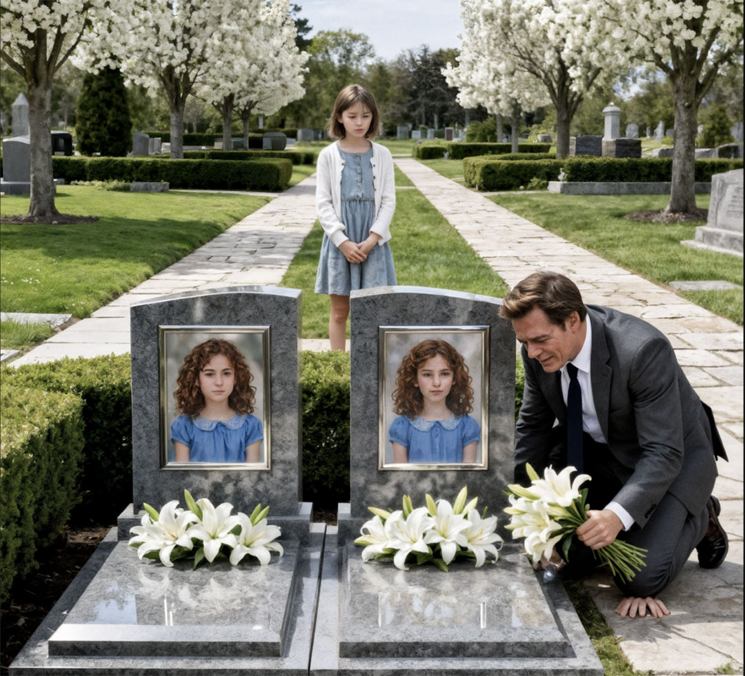 Chaque semaine, il déposait des lys sur les tombes de ses jumelles, persuadé de parler à des petites filles qu’il ne reverrait jamais. Deux ans de deuil figé, de questions sans réponse et de visites au cimetière comme seul fil qui le maintenait debout. Jusqu’au jour où une fillette, mal chaussée mais au regard étonnamment franc, s’est approchée, a désigné les pierres tombales… et a prononcé ces mots qui allaient tout bouleverser : « Monsieur… elles habitent dans ma rue. »