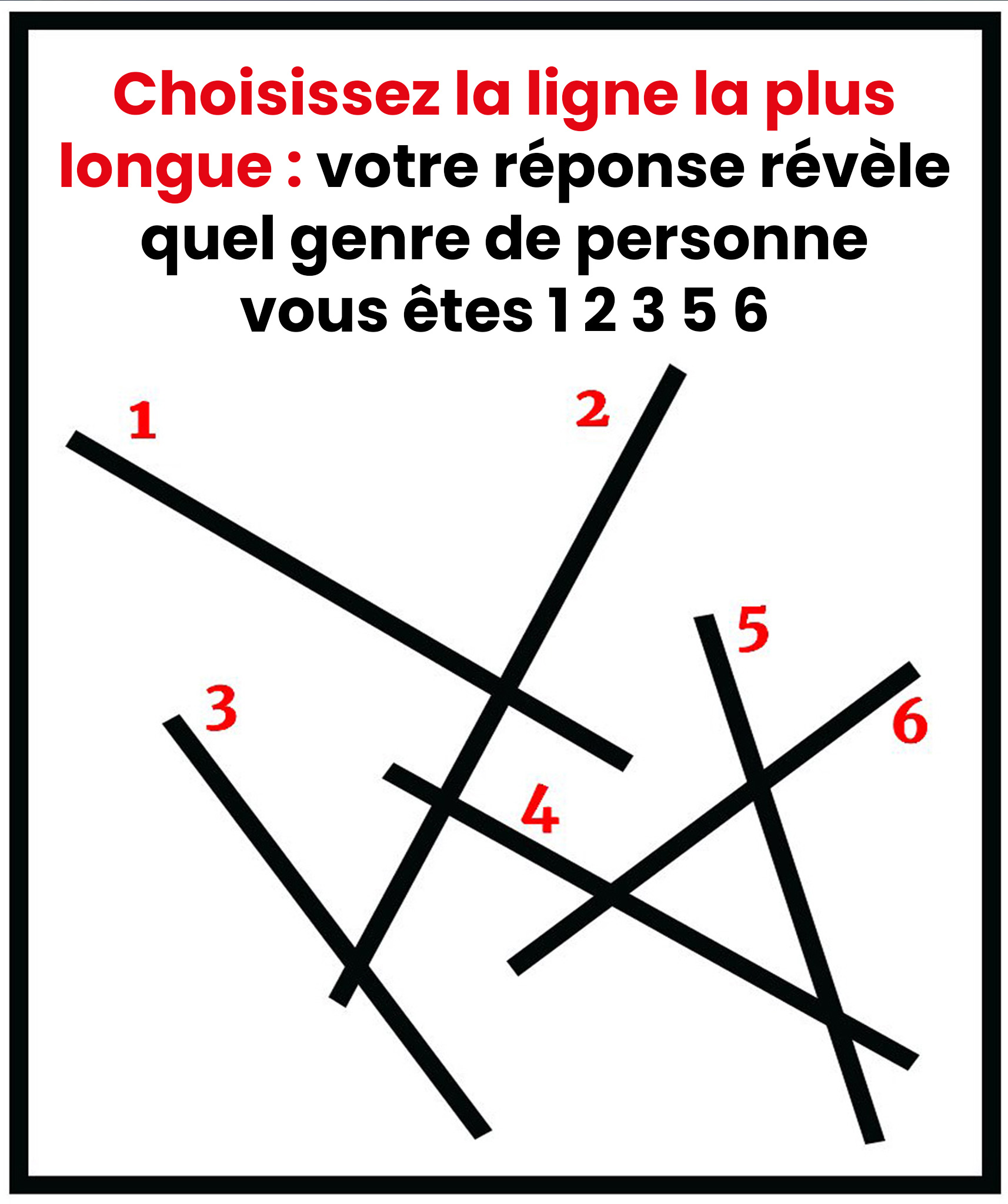 Ce test visuel apparemment simple, où six traits noirs s'alignent, révèle bien plus qu'une simple perception. Votre sélection instinctive met en lumière votre manière unique d'appréhender le monde et vos traits de caractère profonds. Êtes-vous prête à découvrir ce que ce choix dit de vous ?
