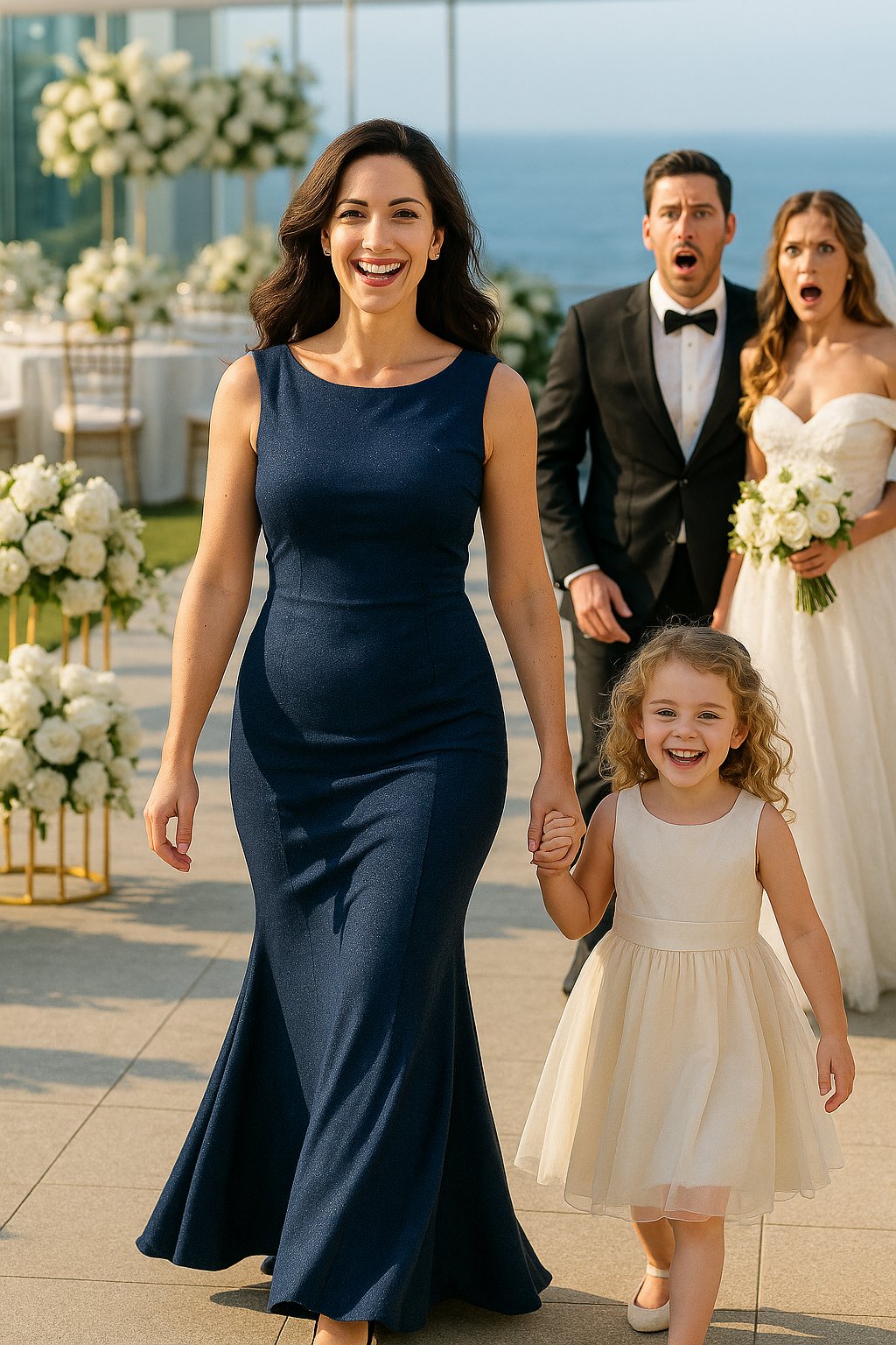 Le jour tant attendu, Camille fit une entrée aussi gracieuse qu’inattendue. Tenue bleu marine, port altier, regard serein… elle rayonnait d’une assurance tranquille. Mais ce qui laissa l’assistance sans voix, ce fut cette enfant minuscule qui serrait sa main. Quatre petites années, cheveux bouclés et dorés, yeux couleur noisette… et cette ressemblance frappante avec une personne bien connue.