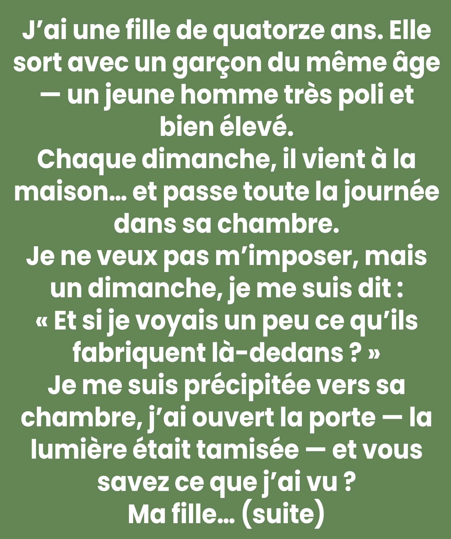 Depuis quelques semaines, Théo venait chez nous chaque dimanche. Poli, gentil, toujours un sourire timide. Ils montaient dans la chambre de Léna et n’en ressortaient que pour le goûter. Rien d’alarmant en soi… mais plus le temps passait, plus mon imagination s’emballait.