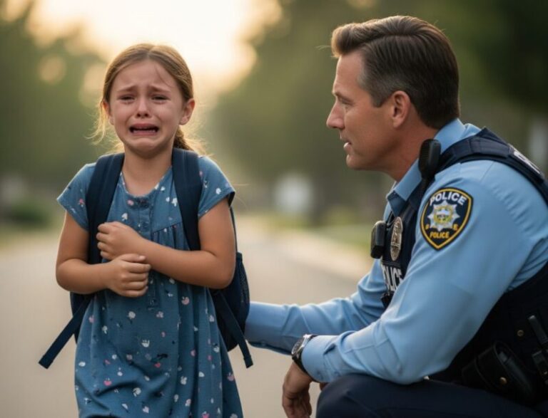 Après avoir parcouru plusieurs rues, elle distingue enfin deux fonctionnaires en mission de surveillance. Sans la moindre hésitation, elle se dirige résolument vers eux. L’officier perçoit instantanément son état de détresse : cette jeune fille, isolée et visiblement perturbée, n’est pas là par simple curiosité. Il s’avance avec délicatesse, mais l’enfant fond en larmes et se blottit contre lui.