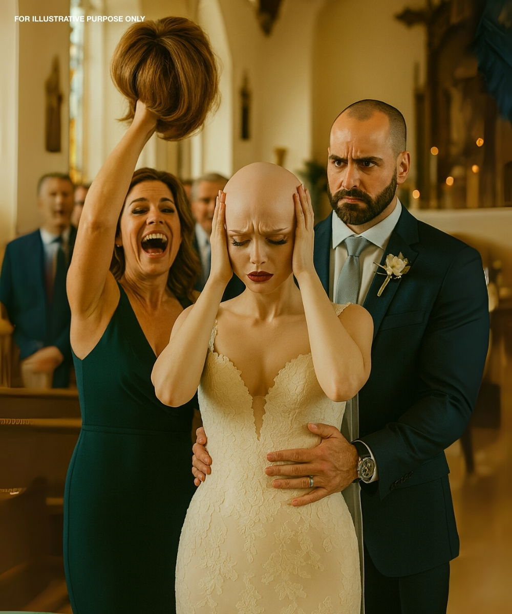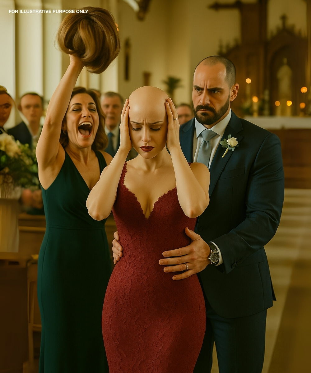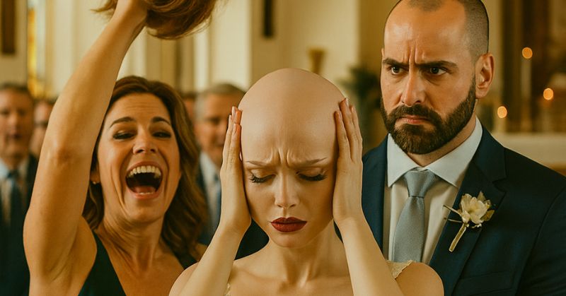 Alors que je m’approchais de l’autel, elle s’est avancée. Sans un mot, Nadine a attrapé ma perruque et l’a jetée, dévoilant mon crâne dénudé devant l’assemblée médusée. Dans un silence glaçant, elle a lancé :