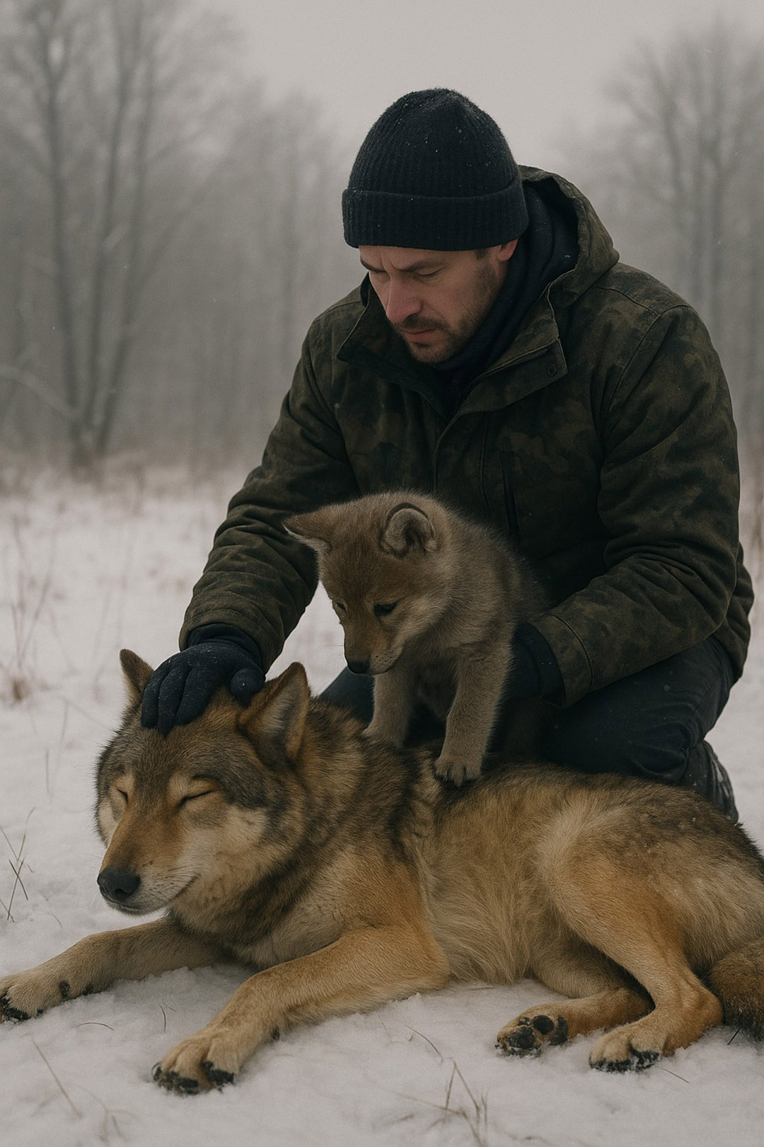 Tandis qu’il progressait avec difficulté sur le chemin verglacé, une tache sombre et immobile contre la neige attira son œil. En se rapprochant, une boule se forma dans sa gorge : une louve gisait là, visiblement blessée, et un louveteau anxieux tournait autour d’elle sans répit. La première réaction, bien naturelle, fut la crainte. On sait tous qu’une bête sauvage peut avoir des réactions imprévisibles. Pourtant, une force intérieure plus puissante que la peur l’empêcha de faire demi-tour et de poursuivre son chemin comme si de rien n’était.