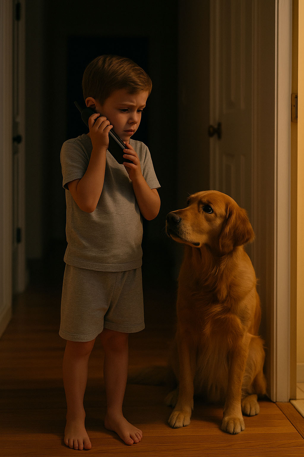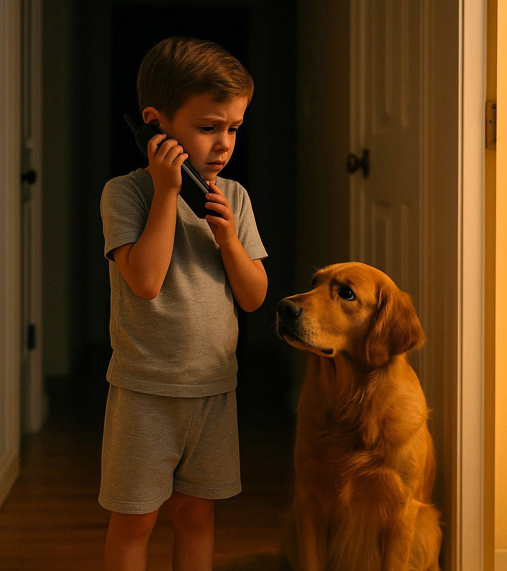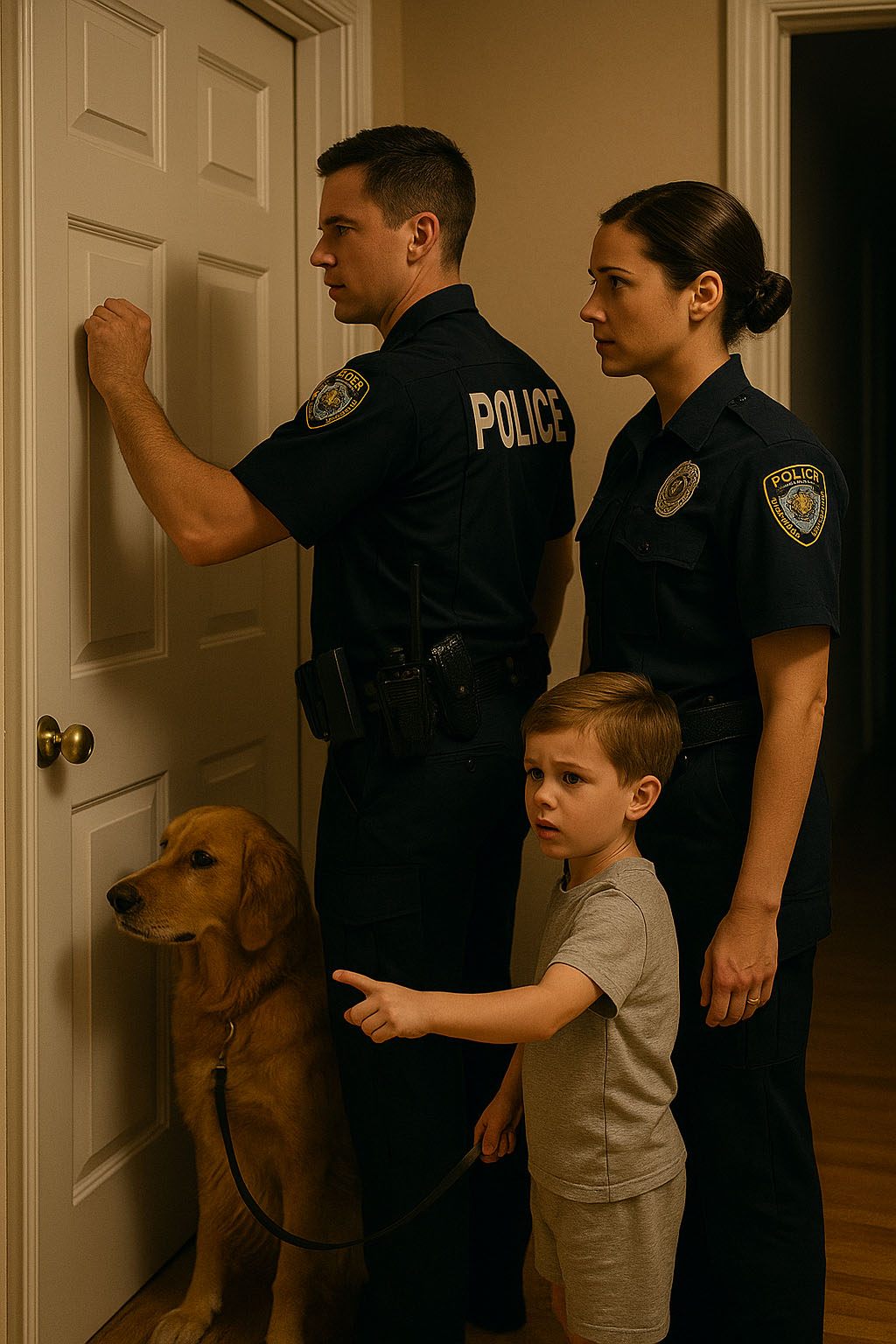 Les agents découvrent un petit garçon anxieux, blotti contre son golden retriever, le regard chargé d’appréhension. Ils montent l’escalier avec précaution, s’annoncent poliment… et tombent sur une scène totalement imprévue.