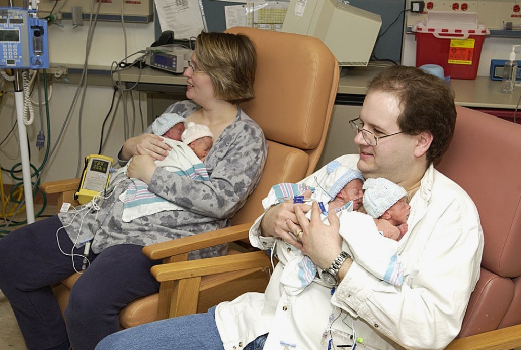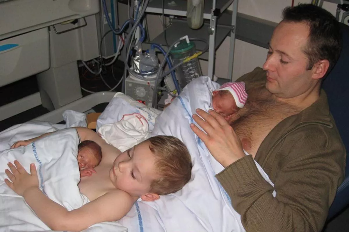 Une photo attendrissante montre le grand frère aidant son père à offrir une thérapie peau à peau à des jumeaux prématurés, un geste qui pourrait littéralement leur sauver la vie
