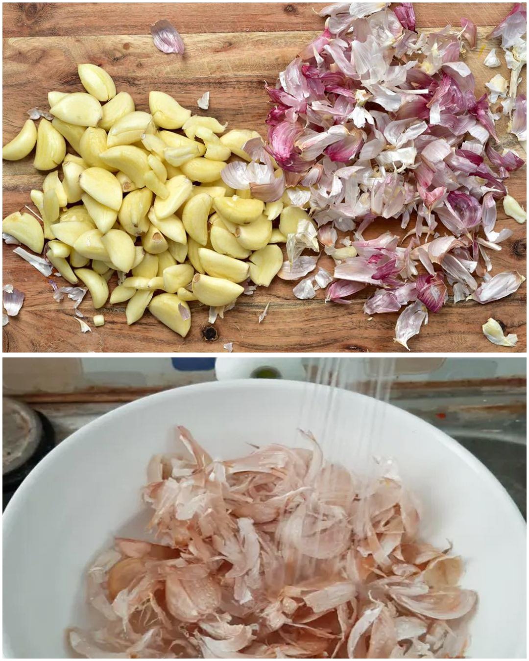 - Rassemblez les peaux d’environ quatre têtes d’ail.