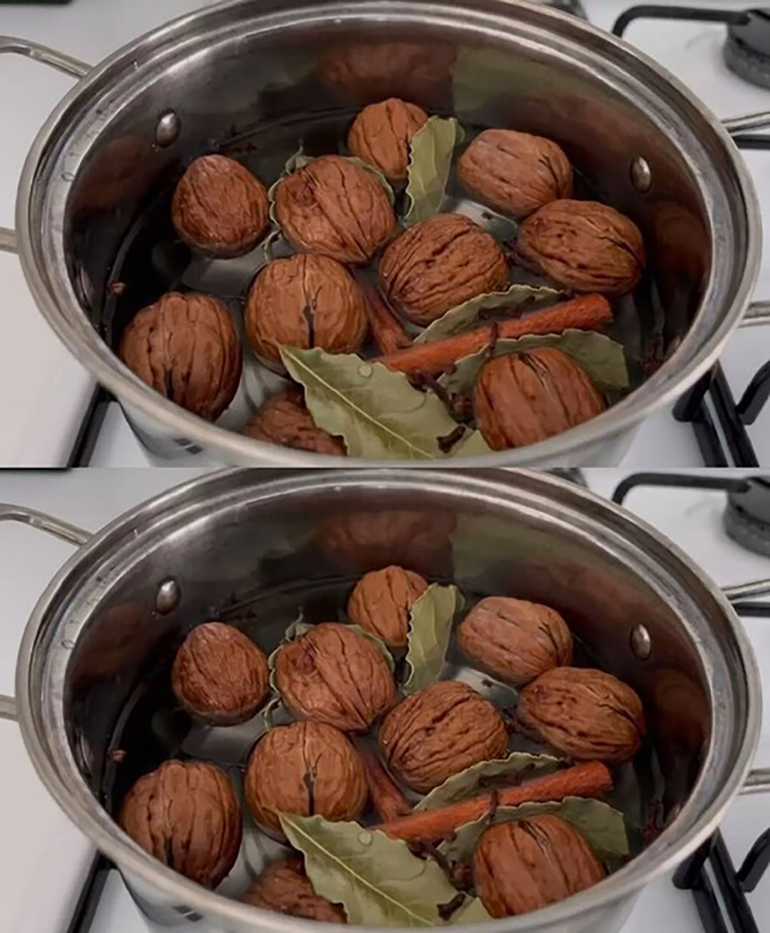 Dans une casserole, réunissez les noix, le laurier, la cannelle et les clous de girofle. Couvrez avec l’eau et portez le tout à ébullition. Baissez ensuite le feu, couvrez et laissez frémir doucement pendant une dizaine de minutes. L’étape cruciale ? Laisser refroidir complètement à couvert ! Cela permet aux principes actifs de bien se libérer. Une fois tiède, filtrez soigneusement le liquide dans un bocal en verre propre. Ajoutez-y l’huile d’olive et le vinaigre de cidre, puis mélangez énergiquement jusqu’à ce que la lotion soit bien homogène.