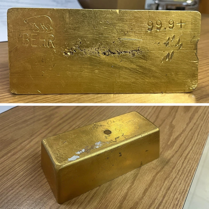 Certains y ont cru voir un précieux métal. La réalité est moins scintillante : ce petit bloc n’était pas en or mais un simple échantillon de peinture métallisée, employé pour des finitions décoratives.