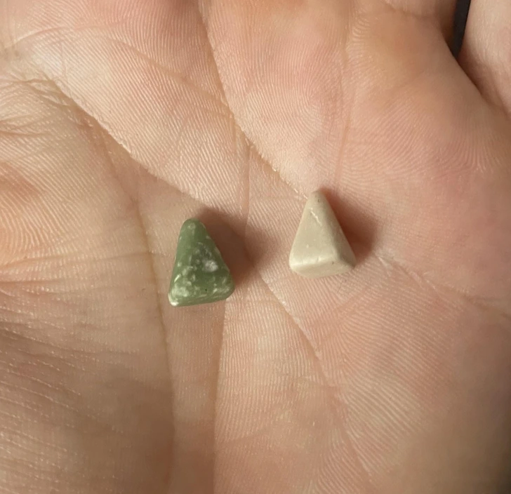 Ces petites pyramides céramiques ne provenaient pas de jeux antiques mais servaient de supports de culbutage dans l’industrie pour polir les pièces métalliques par abrasion douce.