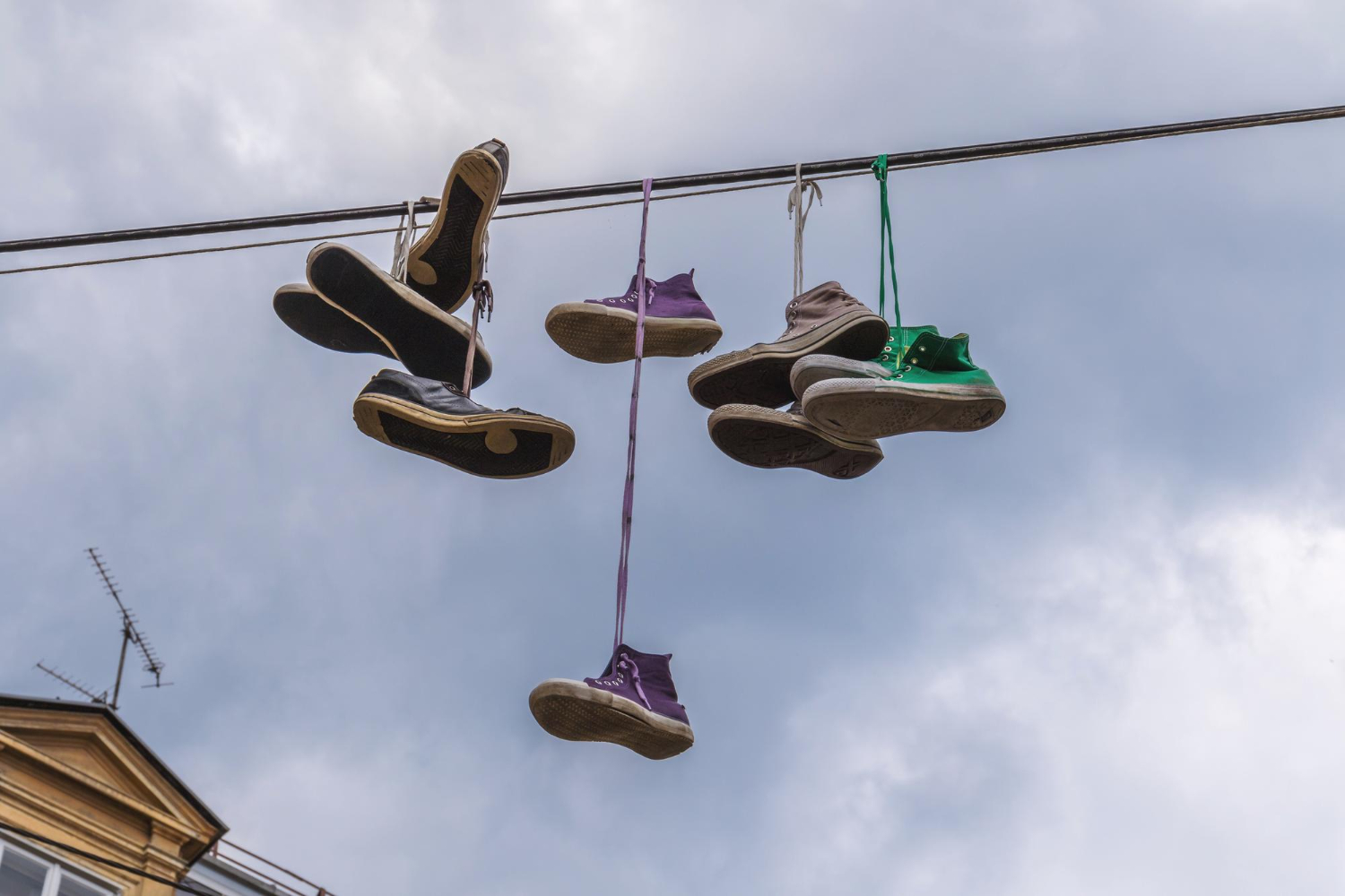 Suspendre des chaussures, c’est jouer avec le paysage, détourner le quotidien, créer un clin d’œil poétique au-dessus des trottoirs.